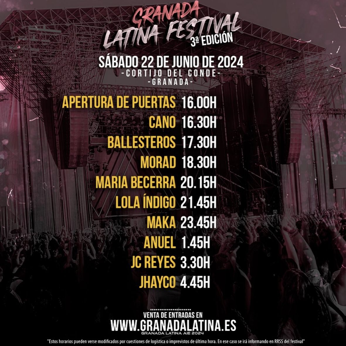 ¡Llegó la hora! Ya ha pasado un año desde que en 2023 se reunieran más de 25.000 personas en el festival Granada Latina Festival, convirtiendo la ciudad en el epicentro de la escena latina. El próximo sábado 22 de junio repetimos cita ineludible en el Cortijo del Conde (Granada) con los máximos referentes internacionales del urban latino: Anuel AA, Jhayco, Lola Índigo, Morad, Maka, María Becerra, Cano, JC Reyes y Ballesteros te esperan en la tercera edición de Granada Latina Festival.
